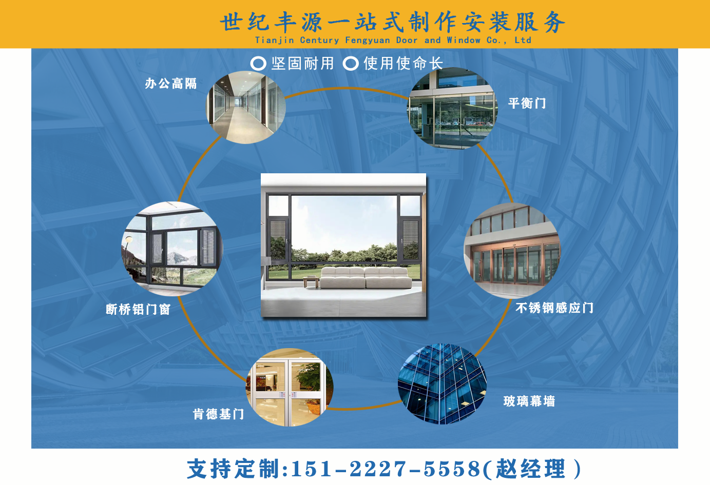 天津世紀(jì)豐源門窗有限公司從事斷橋鋁門窗,玻璃幕墻,平衡門,肯德基門,不銹鋼感應(yīng)門,百葉窗,辦公高隔,制作安裝一站式訂制生產(chǎn)及配套服務(wù)等。 公司自成立以來,始終堅持以人才為本、誠信立業(yè)的經(jīng)營原則,薈萃業(yè)界精英,成熟的技術(shù)、管理方法及企業(yè)經(jīng)驗(yàn)與國內(nèi)企業(yè)的具體實(shí)際相結(jié)合,為企業(yè)供給各個方面的解決方案,使企業(yè)在激烈的市場競爭中始終堅持競爭力,實(shí)現(xiàn)企業(yè)快速、穩(wěn)定地發(fā)展。 質(zhì)量好、服務(wù)好、才能信譽(yù)好,公司已在諸多領(lǐng)域取得輝煌成績,愿意成為您可信賴的長期合作伙伴。 讓我們攜手同行,共同實(shí)現(xiàn)“讓普通老百姓都用得上高端門窗”...